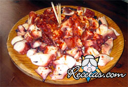 Sirva el pulpo cortado en rodajas (soólo los tentáculos) bañado con la salsa de aceite y acompañado por las papas. Rocíe con aceite de oliva a gusto.